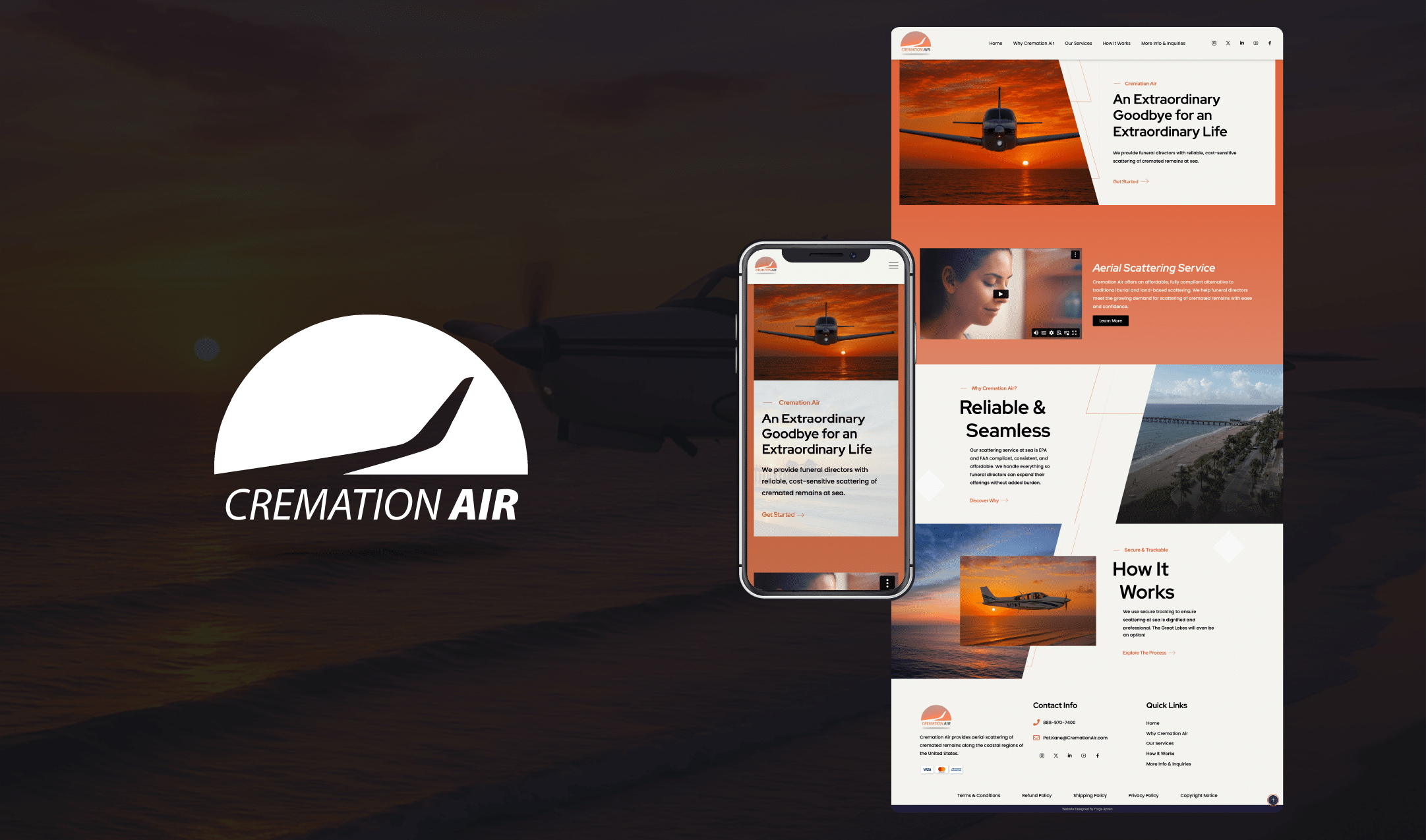 Cremation Air is a new brand that scatters cremated remains over the ocean from an airplane. They needed a website to help them promote their services to a network of funeral directors, as well as to build general online visibility. Forge Apollo built a new website, including a hero video that establishes their core purpose.